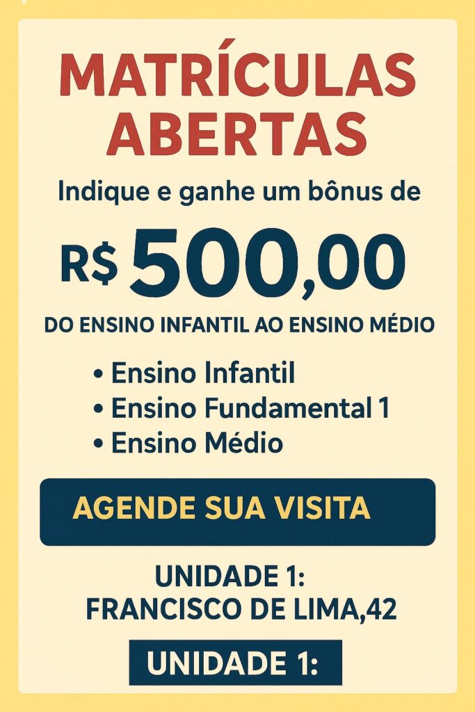 Estamos felizes em anunciar que nossas matrículas para o ano letivo de 2026 já estão abertas! Garanta a vaga do seu filho em um ambiente acolhedor, seguro e cheio de aprendizagem.